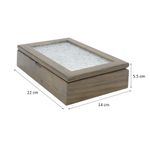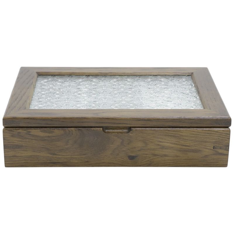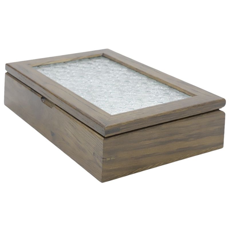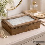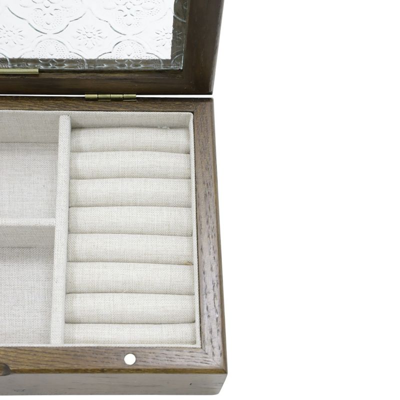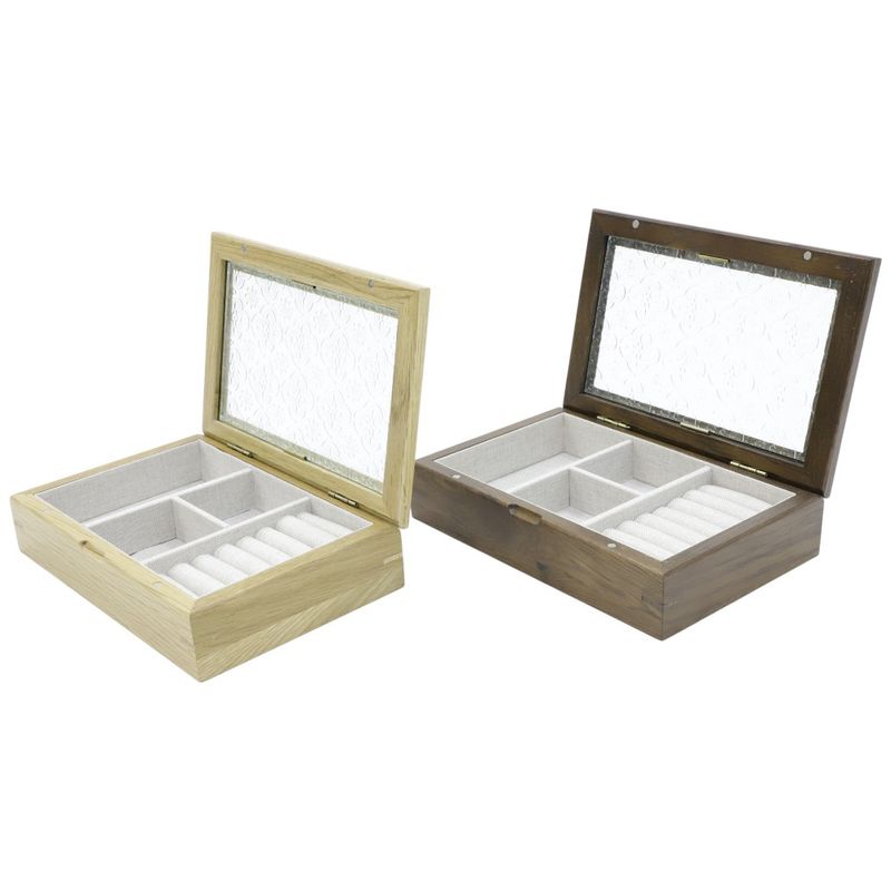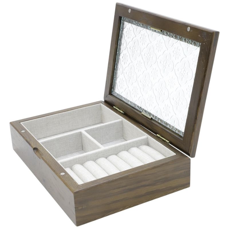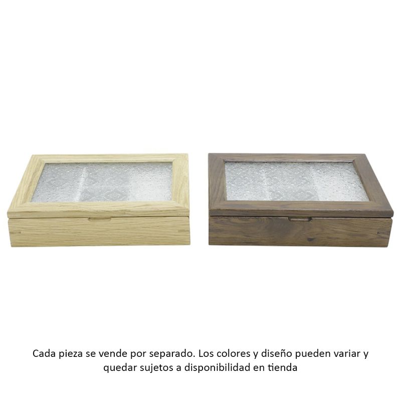Joyero de madera disponible en colores surtidos. Cuenta con tapa de vidrio y compartimentos internos acolchados para proteger anillos, dijes y relojes. Diseño compacto y resistente.