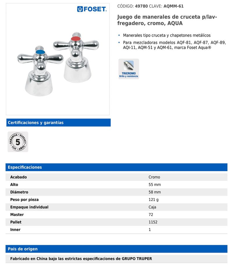 Línea de manerales y juegos de repuesto diseñados para mezcladoras y llaves de lavabo o fregadero, fabricados en metal o ABS con acabado cromo que garantiza durabilidad y resistencia a la corrosión. Disponibles en diferentes estilos ?hexagonal, tipo palanca, tipo cono, acrílico transparente o tipo cruceta? para mantener la estética original y funcionalidad de cada instalación.