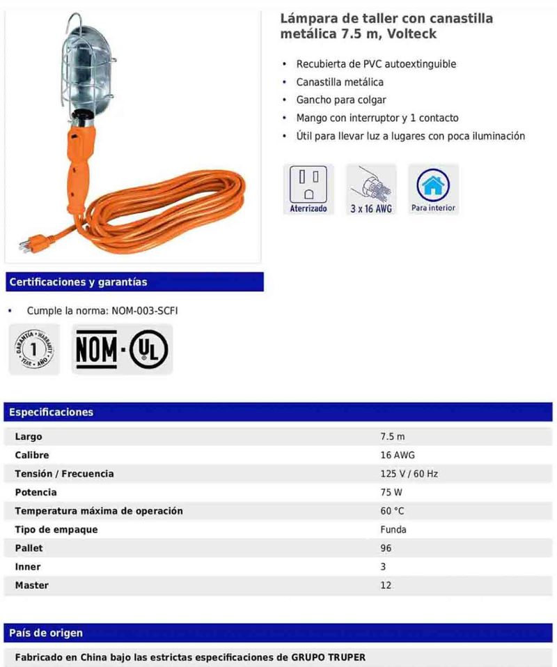 Lámpara portátil diseñada para iluminar zonas con poca visibilidad, equipada con canastilla metálica resistente y gancho para colgar que facilita su uso en áreas de mantenimiento y reparación. Incluye interruptor integrado y contacto aterrizado, además de un cable recubierto de PVC autoextinguible para mayor seguridad.