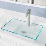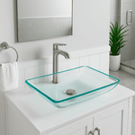 Instalación distintiva: descansando en el tocador, el fregadero de cristal llama la atención como una obra de arte, así como un elemento funcional del baño; el brillo del vidrio es algo para contemplar