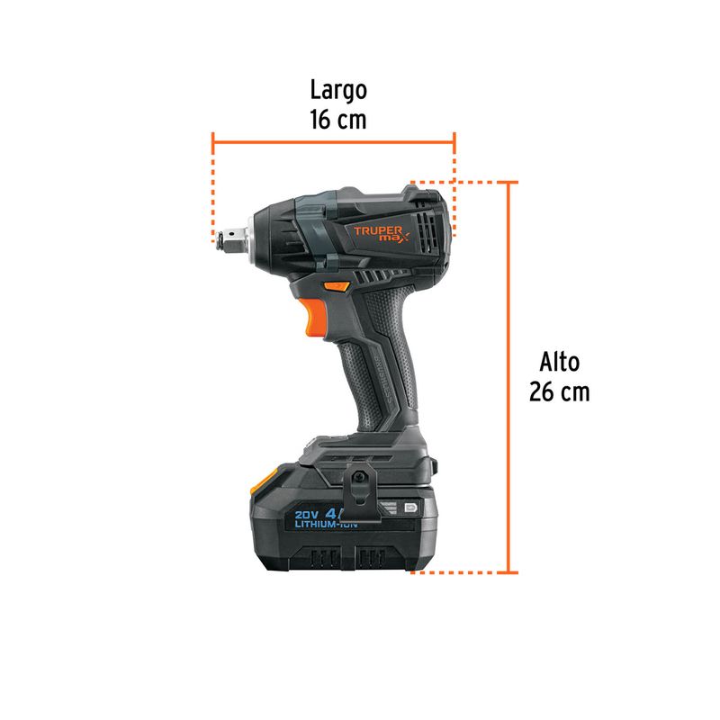 Llave de impacto inalámbrica con motor libre de carbones que ofrece alto desempeño y menor mantenimiento, ideal para el ajuste de tornillos y tuercas estándar de alta resistencia. Incorpora impulsor de cuadro de 1/2 in con pasador retenedor, selector de tres velocidades y niveles de torque para mayor versatilidad, batería de ion litio de 20 V, luz LED para el área de trabajo, indicador de nivel de carga y mango con grip antiderrapante para un manejo seguro y cómodo.
