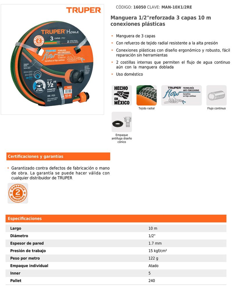 Esta manguera doméstica está diseñada para ofrecer alto rendimiento y durabilidad. Su estructura de 3 capas con refuerzo de tejido radial garantiza resistencia a la presión y un flujo constante en cada uso.
