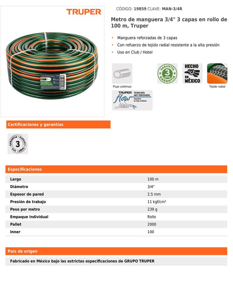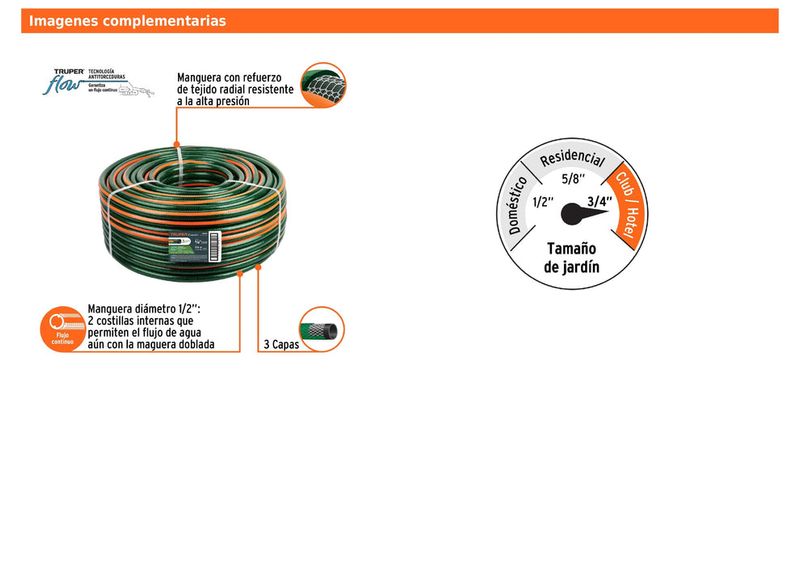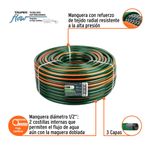 Ideal para trabajos caseros de riego o limpieza, este rollo de manguera combina flexibilidad y resistencia en una estructura de 3 capas. Su refuerzo con tramado radial de 8 hilos le brinda mayor durabilidad ante la presión constante del agua.