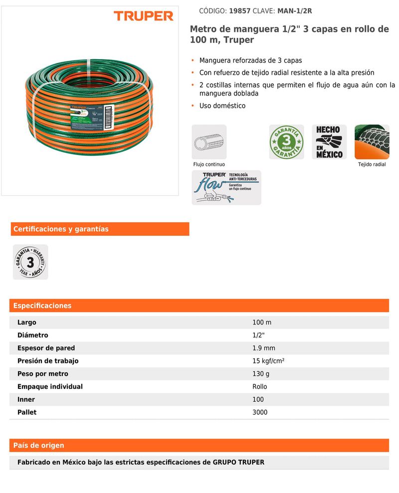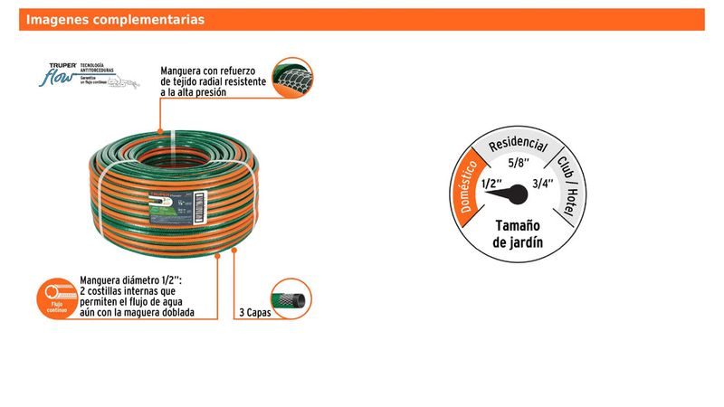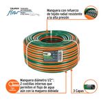 Ideal para trabajos caseros de riego o limpieza, este rollo de manguera combina flexibilidad y resistencia en una estructura de 3 capas. Su refuerzo con tramado radial de 8 hilos le brinda mayor durabilidad ante la presión constante del agua.