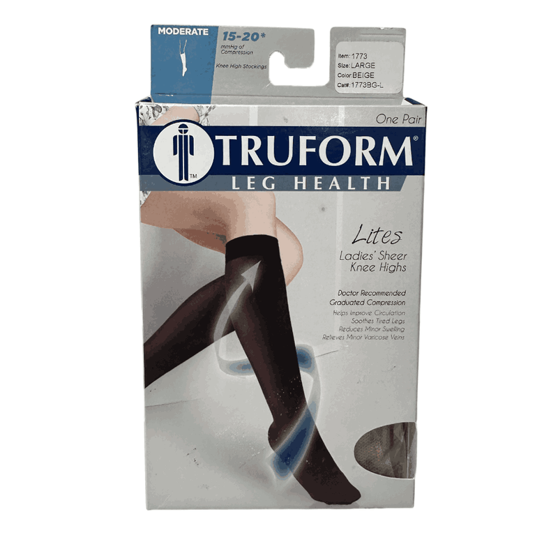 Las medias de compresión hasta la rodilla marcan Truform 1773 son la opción ideal para damas y para mejorar la circulación y aliviar diversas molestias en las piernas. Con una compresión graduada de 15-20 mmHg, estas medias ayudan a reducir la hinchazón, aliviar el dolor de piernas cansadas, las venas varicosas, las arañas vasculares, el edema y el riesgo de coágulos sanguíneos.