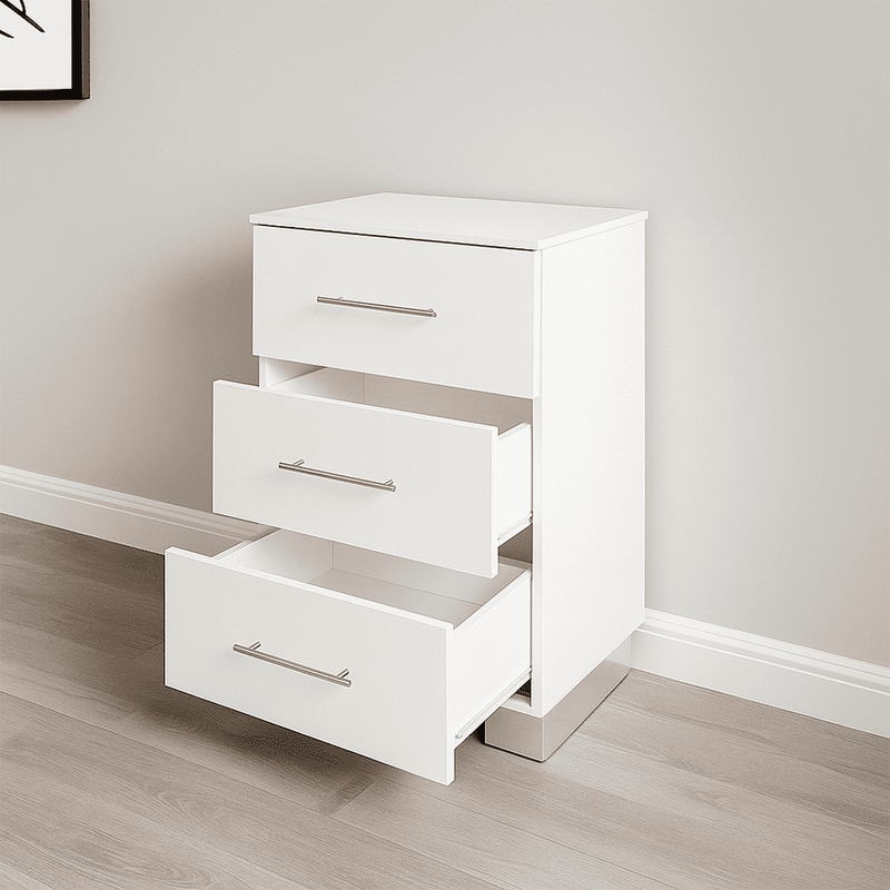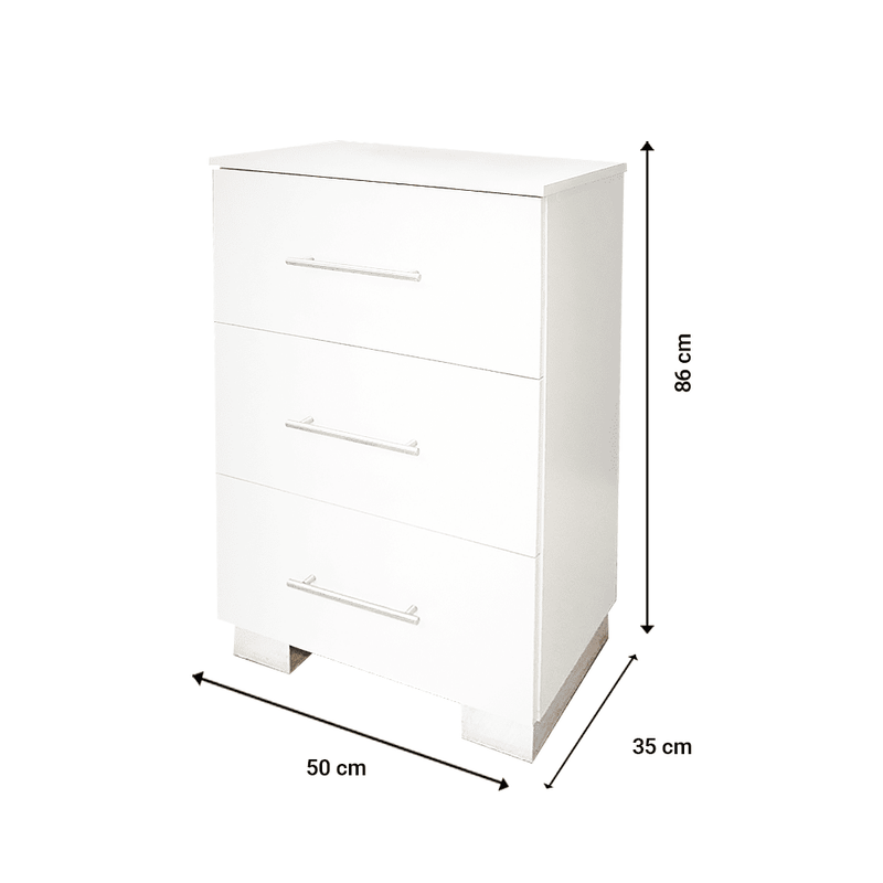 Mesa de noche Elaris – Estilo refinado y gran capacidad Con 3 gavetas amplias, haladeras de barra cromadas y estructura elevada, la mesa Elaris es perfecta para quienes buscan elegancia y funcionalidad en un solo mueble. Elaborada en melamina chilena de alta calidad, fondo en MDF y rieles telescópicos que facilitan su uso diario.