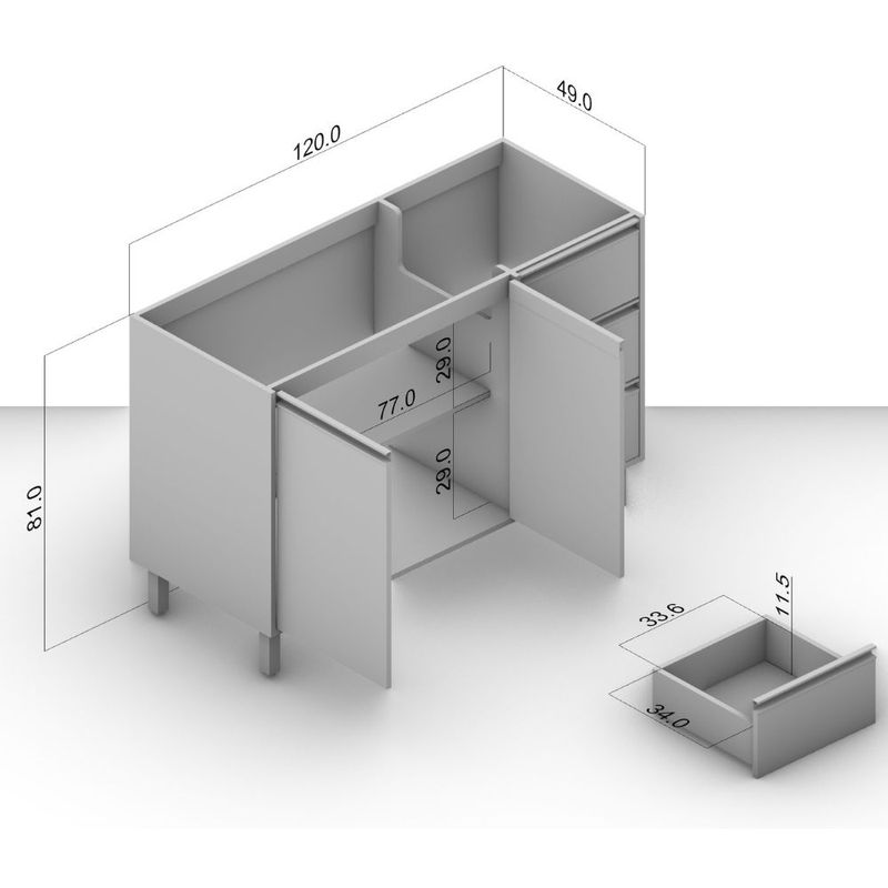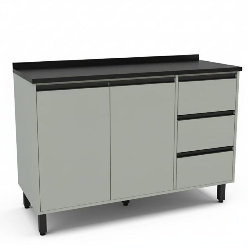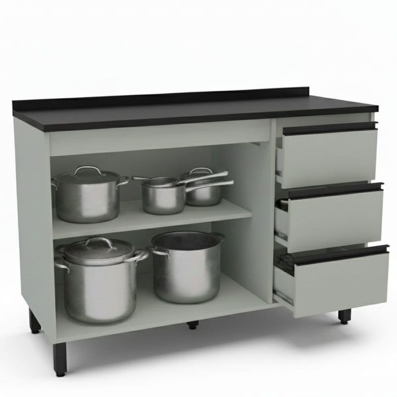 Ofrece 2 puertas con amplio espacio de almacenamiento, 3 cajones para cubiertos, utensilios entre otros.