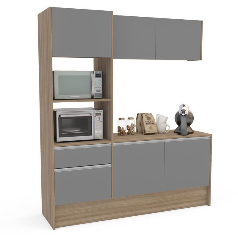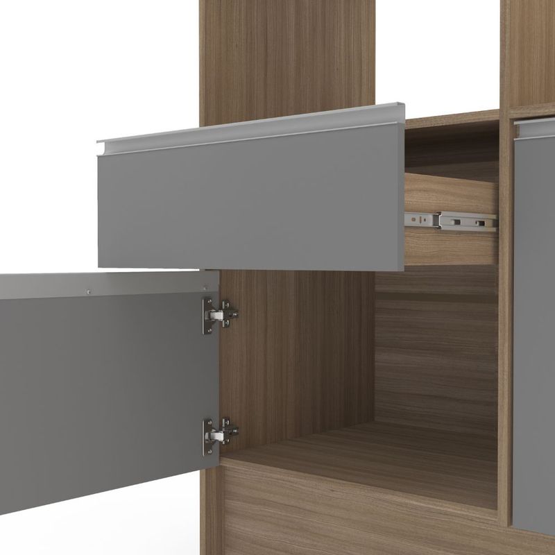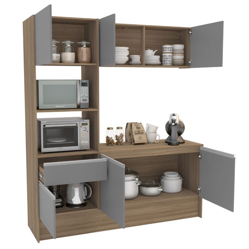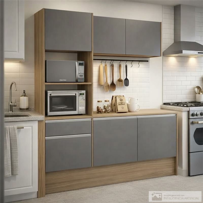 Transforma tu cocina con este elegante y funcional mueble modular, diseñado para ofrecer la máxima organización sin sacrificar el estilo, Su combinación de grises contemporáneos y cálida madera, crea un ambiente moderno y acogedor.