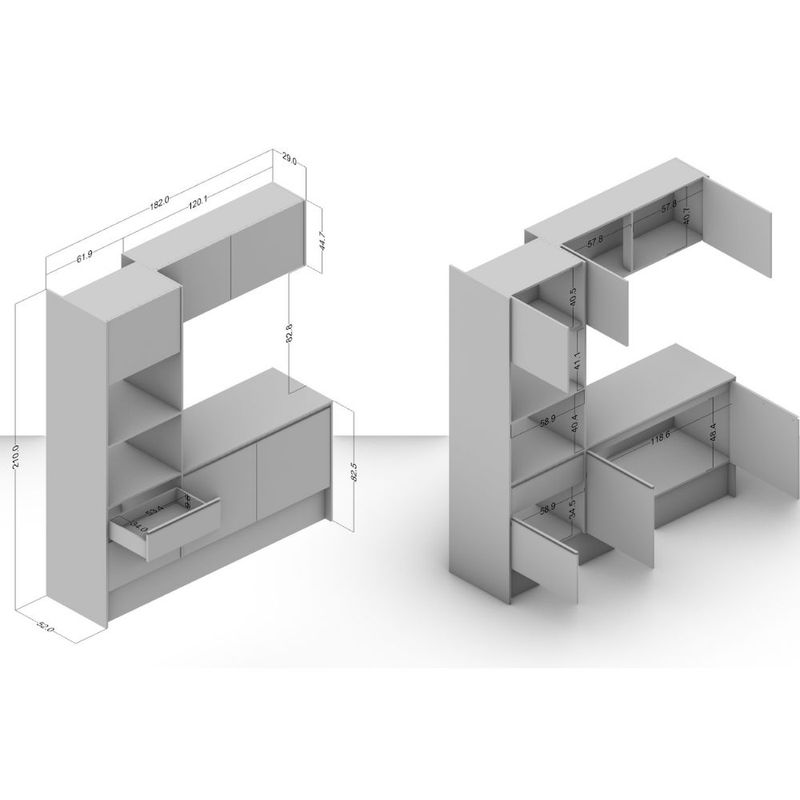 Cuenta con dos piezas: la torre unida con la base y el mueble aéreo de 2 puertas que requiere instalación. Además posee 5 amplias repisas con puertas mas dos repisas a la vista. Incluye dos cajones con rieles suaves para cubiertos y utensilios.