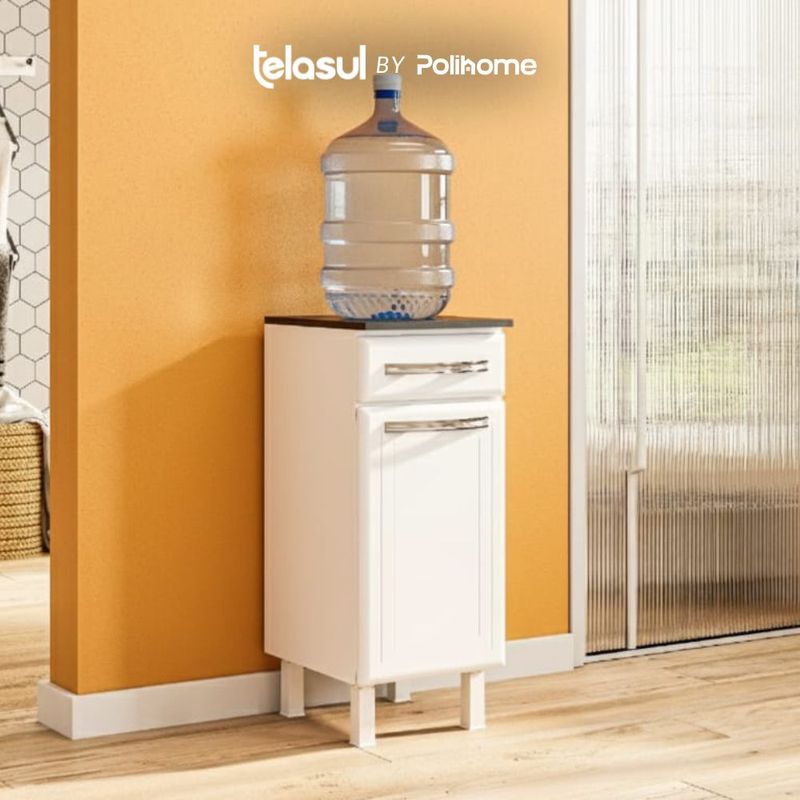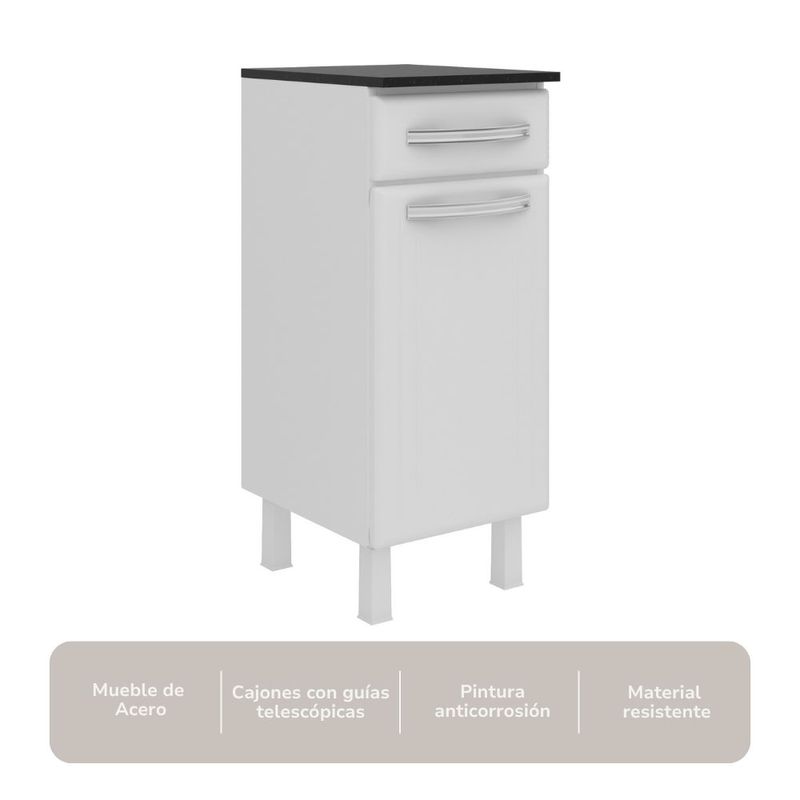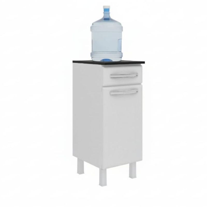 Cuenta con un cajón superior para guardar objetos pequeños, y un compartimento con puerta para artículos mas grandes como garrafones, etc.