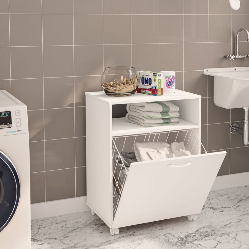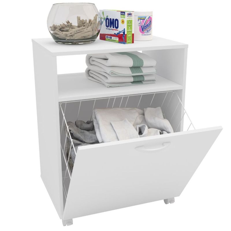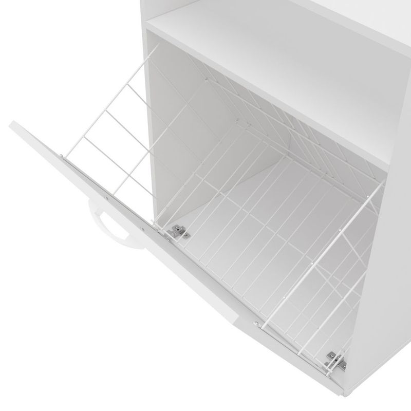Cuenta con 3 niveles, una superficie superior para artículos decorativos o productos de uso diario, un estante intermedio para toallas, y un compartimento inferior abatible tipo canasto para ropa sucia o almacenamiento adicional.
