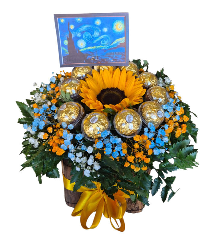 Amante de los arreglos fuera de serie? Este arreglo floral hara de ese dia muy especial al combinar la calidez de un girasol rodeado de chocolates ferrerro rocher y flores de complemento