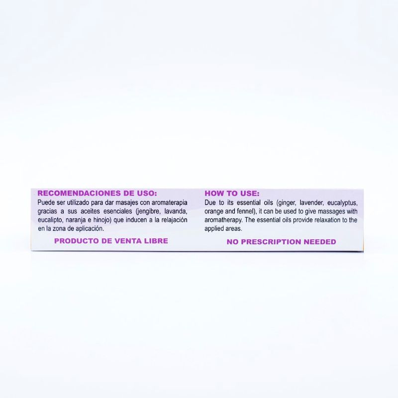 Indicaciones: Ayuda a relajar el musculo y a calmar las molestias en las articulaciones. Puede usarse como masaje aromático y con otros medicamentos sin causar efectos secundarios Contra- Indicaciones: Sólo para uso externo. No apto para usar durante el embarazo. Contiene glucosamina procedente de quitina natural. Diabéticos y quienes tomen anticoagulantes (disolvenes sanguíneos) deben consultar con su médico antes de usar este producto. No ap