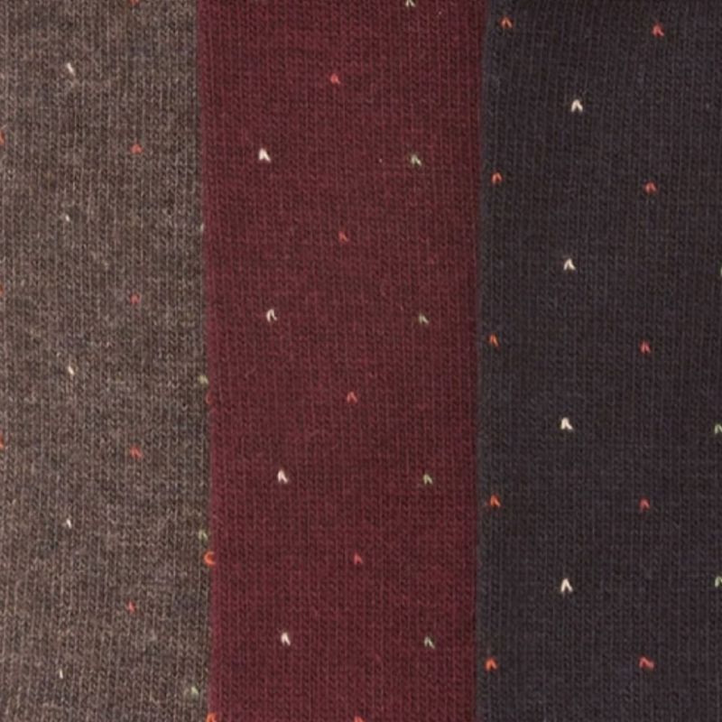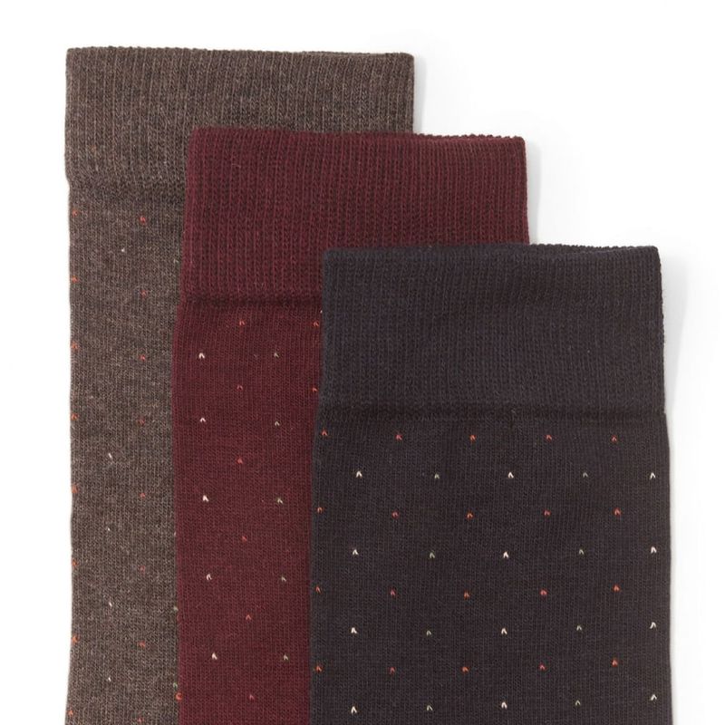 Paquete de 3 pares de calcetines largos marca Sfera, con diseño de puntos: azul navy, color vino, y café.