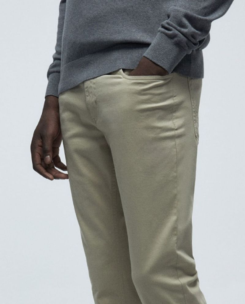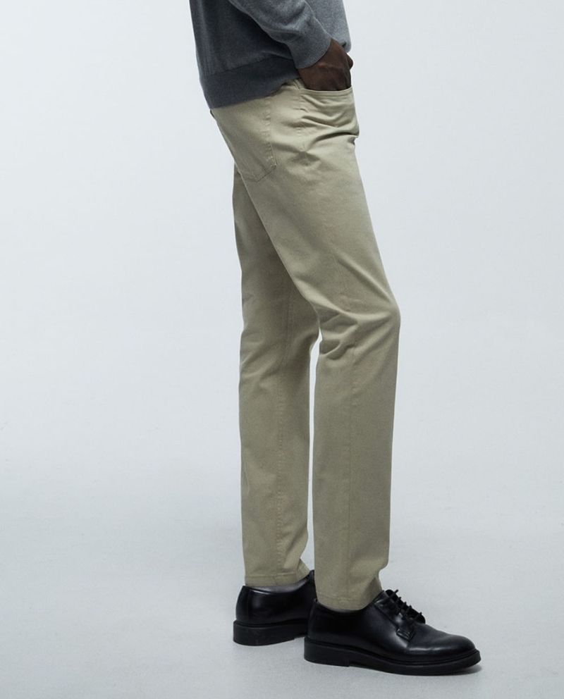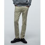 Pantalón casual slim fit de la marca Sfera, diseño sólido en color beige y cierre de botón y cremallera.