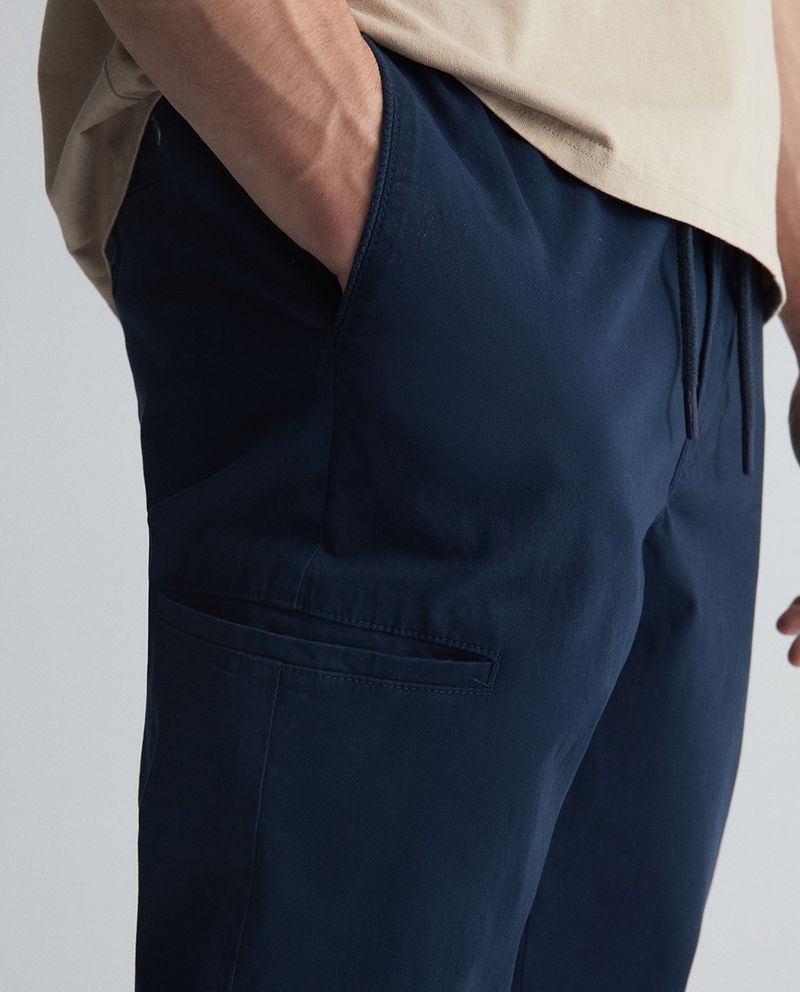 Pantalón casual marca Sfera, diseñado en color azul sólido con cintura elástica y cordón ajustable.