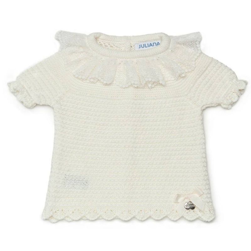 Este delicado conjunto de 2 piezas para bebé niña combina ternura y elegancia en un diseño clásico. Incluye una blusa de manga corta confeccionada en tejido suave, con cuello redondo adornado con un volante de encaje y detalles calados en los bordes. El diseño incorpora una sutil aplicación de moño con dije metálico decorativo en la parte inferior. La prenda se complementa con un bombacho a juego, también tejido, con bordes ondulados que brindan un ajuste cómodo y encantador. Ideal para ocasiones especiales o para lucir con estilo en el día a día.
