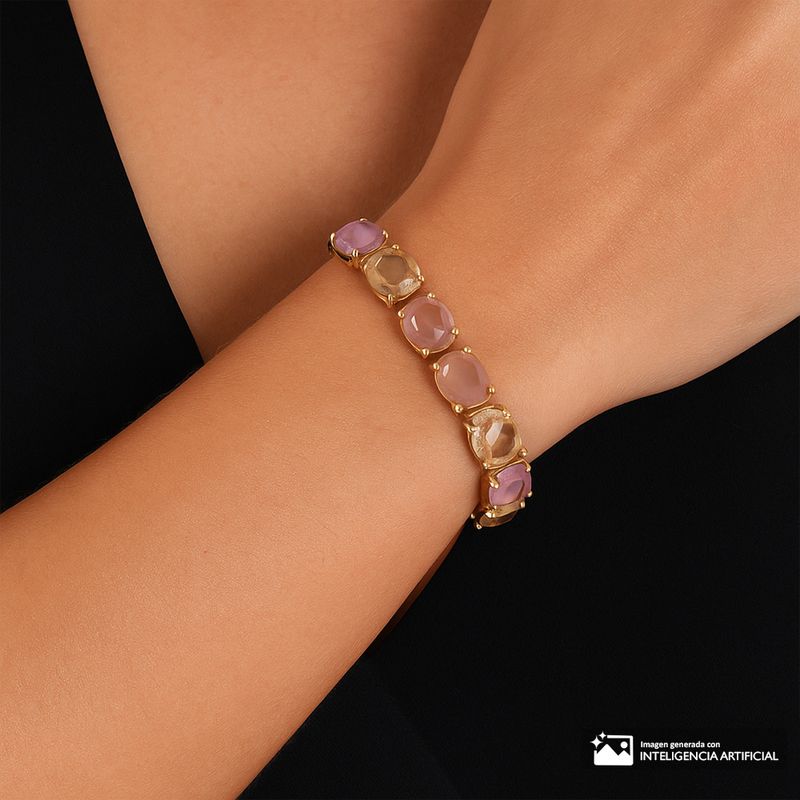 Pulsera elegante de Anne Klein con diseño de cristales facetados en tonos lila, ámbar y nude montados en base dorada. Su sistema elástico la hace cómoda y fácil de colocar, adaptándose perfectamente a la muñeca. Ideal para un look sofisticado y moderno.