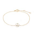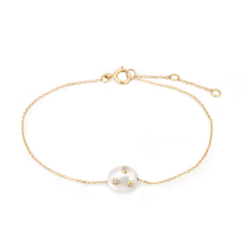 Esta elegante pulsera de oro de 14 quilates destaca por su perla natural que aporta un toque clásico y sofisticado. Tres zafiros blancos incrustados complementan la pieza, brindando un brillo sutil y un estilo refinado. Perfecta para ocasiones especiales o como un accesorio diario que realza cualquier atuendo, esta pulsera combina la delicadeza de la perla con el lujo del oro y los zafiros, convirtiéndola en una joya imprescindible.