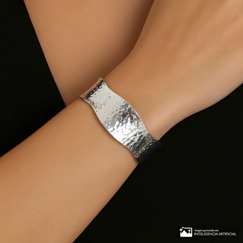Pulsera rígida en tono plateado con acabado martillado que crea un juego de texturas brillantes y orgánicas, aportando un estilo moderno y auténtico; su diseño ancho y curvo abraza la muñeca con comodidad, mientras que su estructura abierta permite colocarla fácilmente, convirtiéndola en un accesorio llamativo y versátil que realza cualquier look con un toque artístico y contemporáneo.