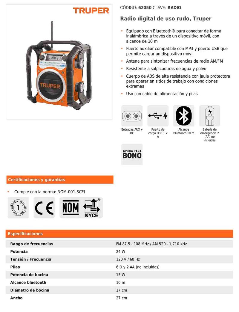 Radio digital diseñado para trabajos en condiciones extremas, equipado con Bluetooth para conexión inalámbrica de hasta 10 m. Incluye puerto auxiliar compatible con MP3, puerto USB para carga de dispositivos móviles y antena AM/FM para sintonización precisa. Su cuerpo de ABS con jaula protectora ofrece alta resistencia a impactos, salpicaduras y polvo. Funciona con cable de alimentación y pilas, brindando versatilidad en sitios de trabajo.