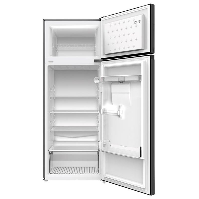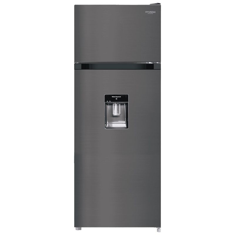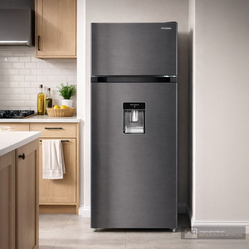 Refrigeradora Hyundai HYRF202NF (200 L) ideal para familias pequeñas o medianas, sistema no frost, evita la formacion de escarcha y reduce mantenimiento, doble puerta con congelador superior, dispensador de agua, puerta reversible que se adapta facilmente a cualquier espacio, diseño en acero inoxidable elegante, moderno y facil de limpiar.