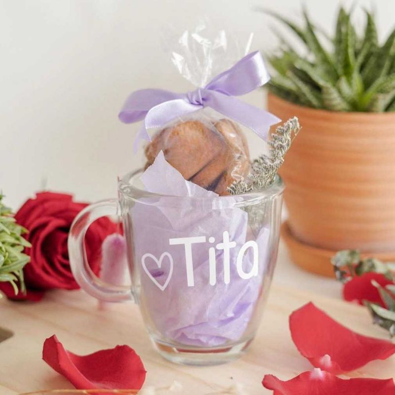 Taza de vidrio. Pack de galletas. Empaque decorado, listón y tarjeta. Gratis: personalizado