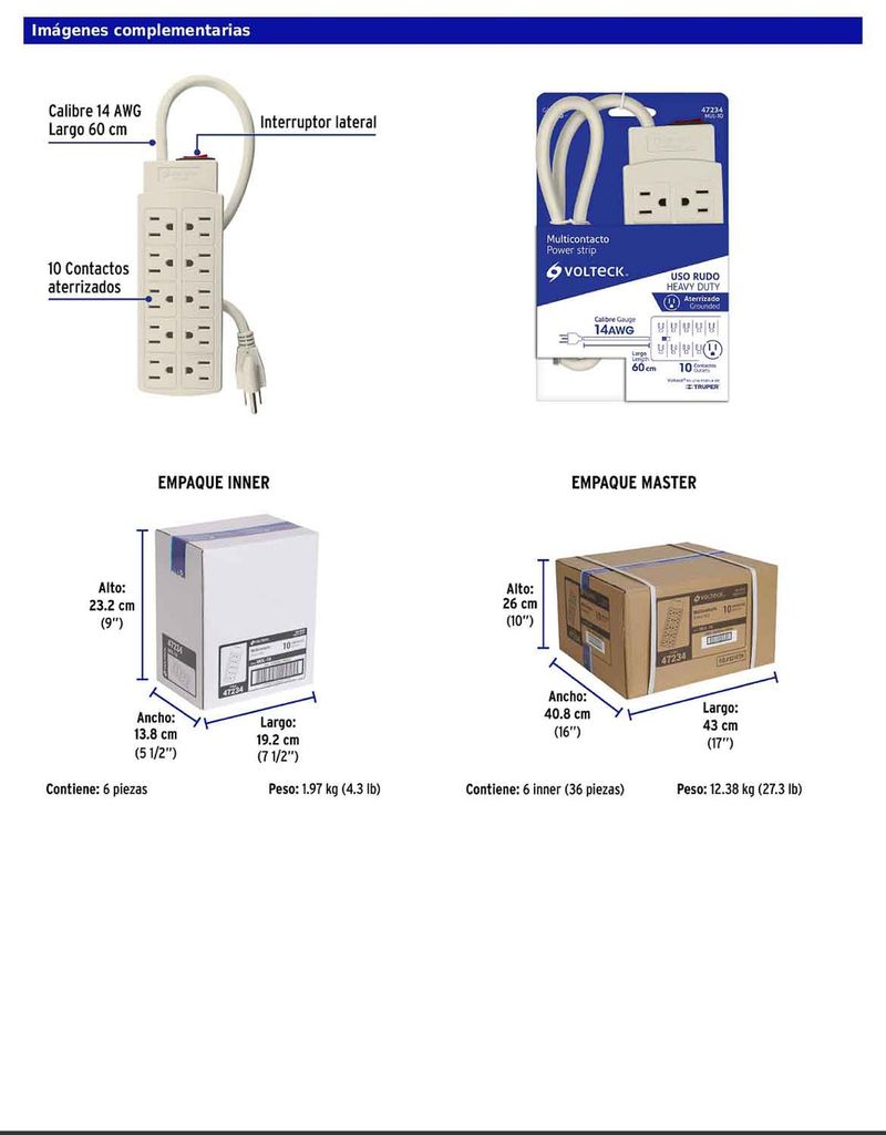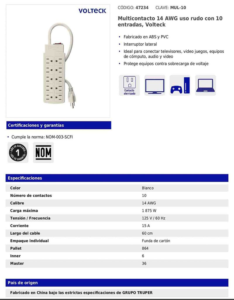 Multicontacto de uso rudo con 10 entradas aterrizadas, fabricado en ABS y PVC, diseñado para conectar televisores, videojuegos, equipos de cómputo y aparatos de audio y video. Cuenta con interruptor lateral, cable calibre 14 AWG de 60 cm y protección contra sobrecargas de voltaje. Cumple con la norma NOM-003-SCFI.