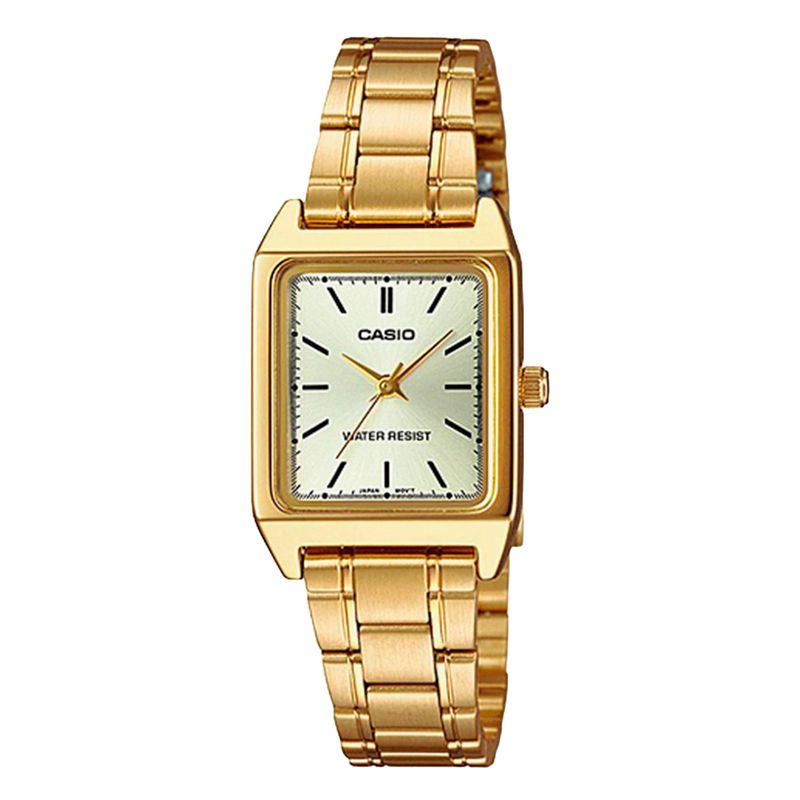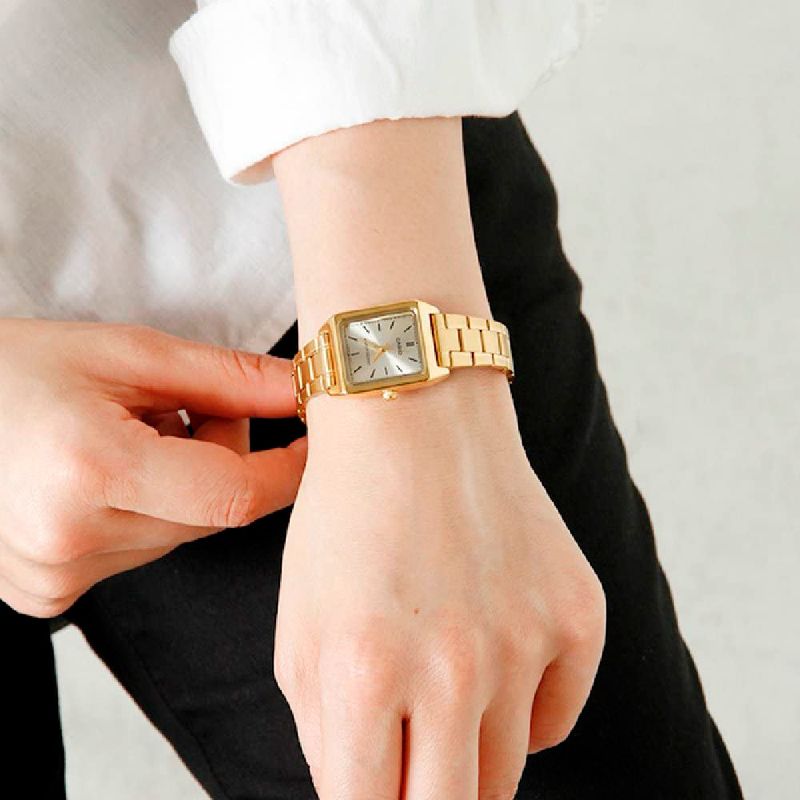 Reloj análogo metálico dorado dama, caja cuadrada, cristal mineral y movimiento de cuarzo, pulsera de acero inoxidable con cierre de clip extensor y resistente al agua.