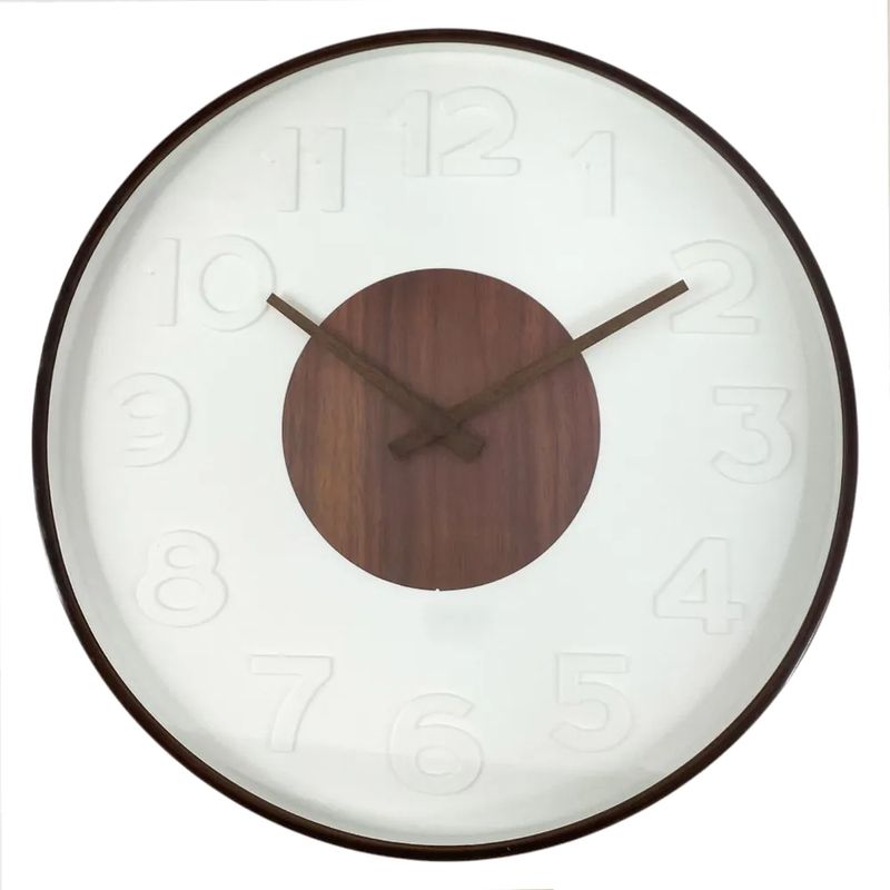 Reloj de pared circular con fondo blanco y marco negro, elaborado en materiales resistentes y con mecanismo de cuarzo. Su diámetro de 40 cm lo hace visible y funcional en salas, oficinas o comedores.