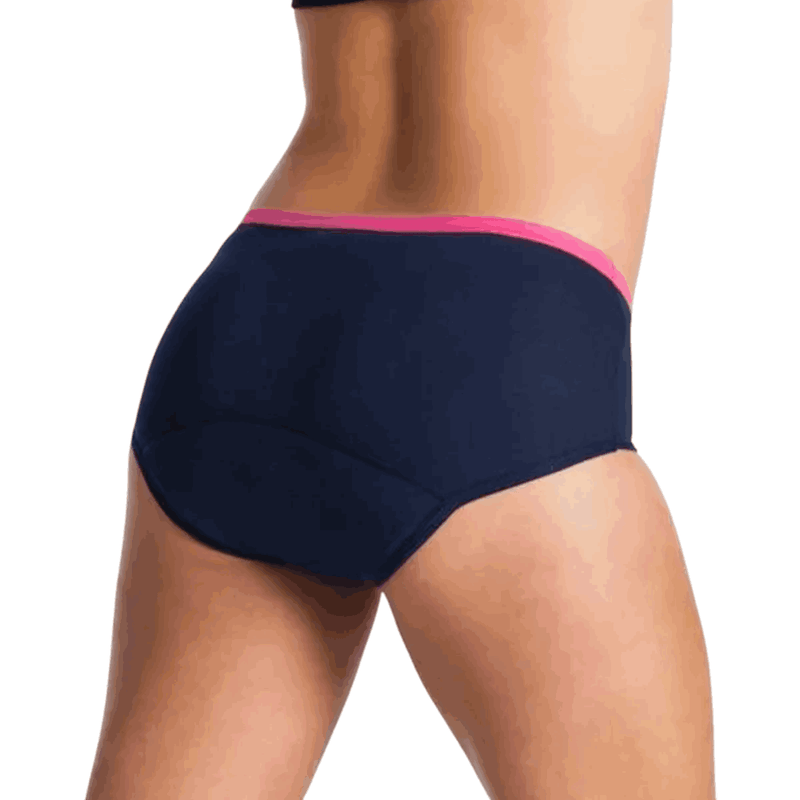 ofrecer comodidad y protección discreta. Con un ajuste perfecto y un diseño moderno en azul oscuro con detalles en fucsia,
