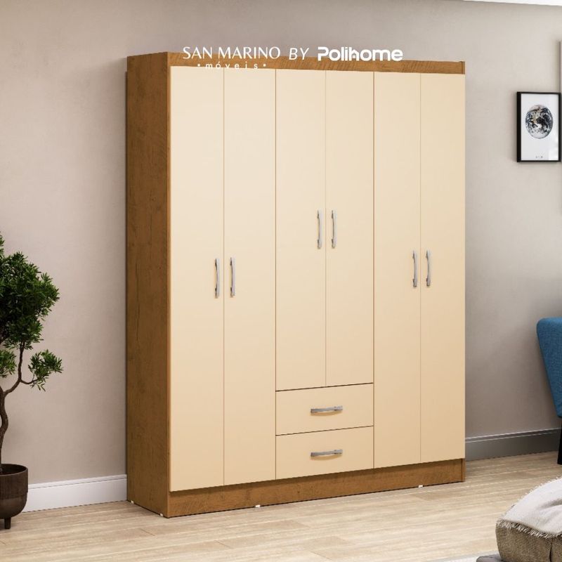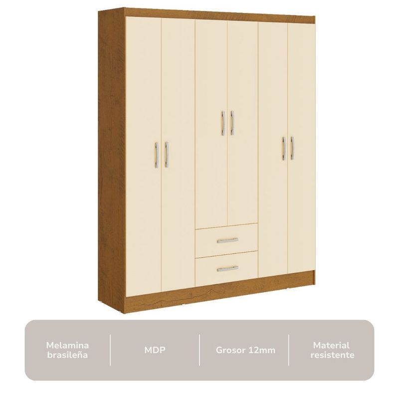 Ofrece 6 puertas con tiraderos metálicos resistentes, dos cajones inferiores ideales para ropa interior, accesorios o prendas pequeñas.