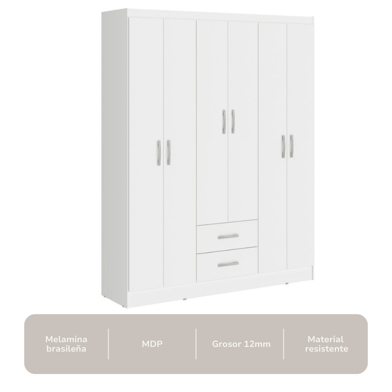 Ofrece 6 puertas con tiraderos metálicos resistentes, dos cajones inferiores ideales para ropa interior, accesorios o prendas pequeñas.