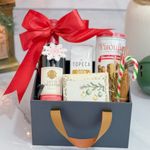 1/2 Botella de vino chileno 375ml. Café Topeca 30 gr, Pirouline, Chocolates, Pin de canela y Candy cane. Caja premium de cartón con azas de semi-cuero, empaque termo fijado decorada con listón y tarjeta.