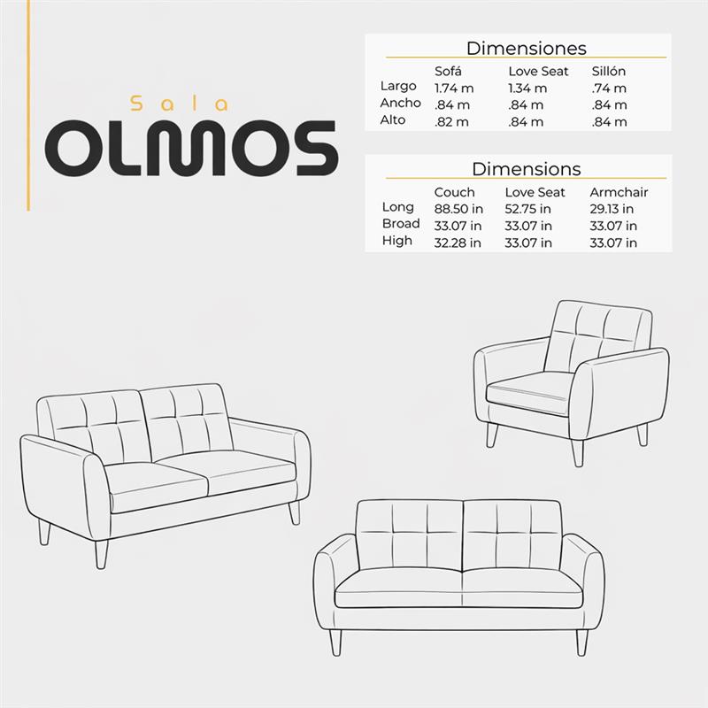 Sala 3-2-1 Olmos combina diseño contemporáneo, confort y funcionalidad en un solo conjunto. Respaldos capitonados y patas de madera aportan un estilo moderno y acogedor, mientras que sus asientos con espuma de alta densidad garantizan comodidad duradera. Ideal para salas medianas y grandes que buscan elegancia, resistencia y un ambiente cálido para compartir en familia.