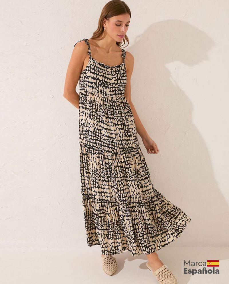 Salida de baño diseño estampado, estilo vestido. Prenda ligera y cómoda, diseñada para cubrir el bikini o traje de baño de manera elegante. Tiene un corte similar a un vestido, con un ajuste suelto que proporciona libertad de movimiento y frescura. Ideal para un estilo relajado y chic, es perfecta para usar después de un baño o en momentos de descanso junto al mar o la piscina. Cuello cuadrado y tirantes con detalle de amarre en hombros.