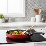 Sartén grande, orientada a preparaciones familiares o comidas con varios ingredientes (salteados, carnes, pescados, frituras, verduras, combos abundantes). Su espaciosa superficie distribuye bien el calor y permite cocinar con comodidad cuando necesitas volumen.