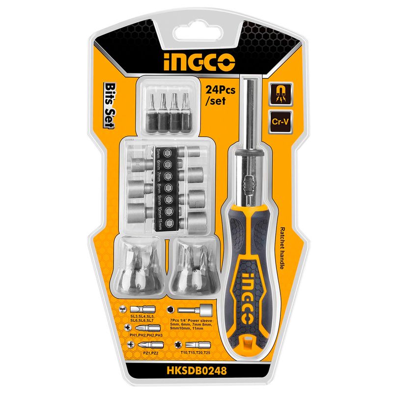 Barra en acero al cromo vanadio. Puntas magnéticas. Incluye 16 puntas: pl3.0-pl4.0-pl5.0-(2)pl6.0-pl7.ph1-(2)ph2-ph3-pz1-pz2-t10-t15-t20-t25. 7 cubos magnéticos de 1/4plg: 5-6-7-8-9-10-11 mm y un ratchet ajustable.