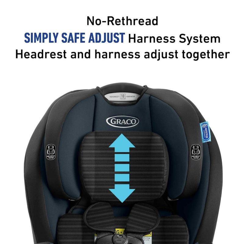 - Sistema Simply Safe Adjust™: ajusta arnés y reposacabezas juntos con un solo movimiento, sin necesidad de re-enhebrar.