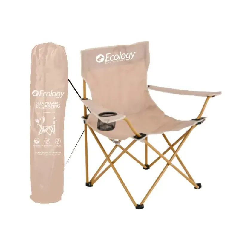 Silla plegable liviana y fácil de transportar. • Estructura resistente ideal para exteriores. • Tela durable y de secado rápido. • Incluye portavasos integrado en el apoyabrazos. • Perfecta para camping, playa o eventos al aire libre.