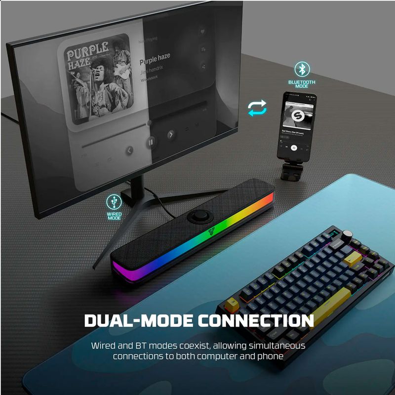 Mejora tu experiencia de audio con el Fantech Groove Bar Pro BS151, una barra de sonido compacta diseñada para ofrecer sonido potente, conectividad versátil y un estilo moderno con iluminación RGB.