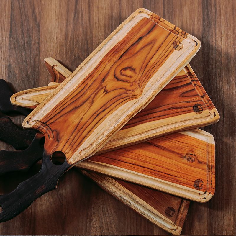 Tablas de madera teca oscura con acabado rústico y aristas desbastadas. El mango sellado con técnica Shou Sugi Ban. Curadas e hidratadas con sal, limón y aceite.