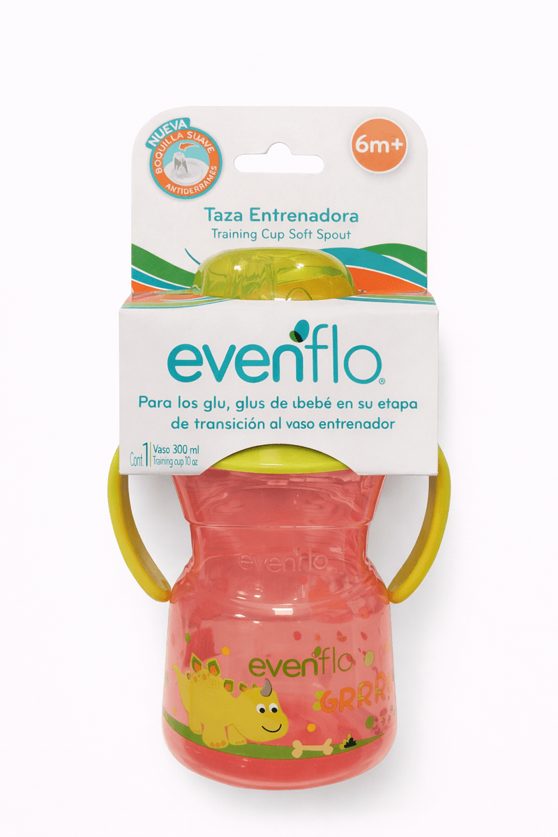 La taza entrenadora Evenflo de 10 oz (300 ml) ayuda a tu bebé en la transición del biberón al vaso. Su boquilla suave protege las encías, mientras que las asas ergonómicas facilitan el agarre. Con divertido diseño rosado y materiales libres de BPA, es ideal para bebés de 6 meses en adelante.