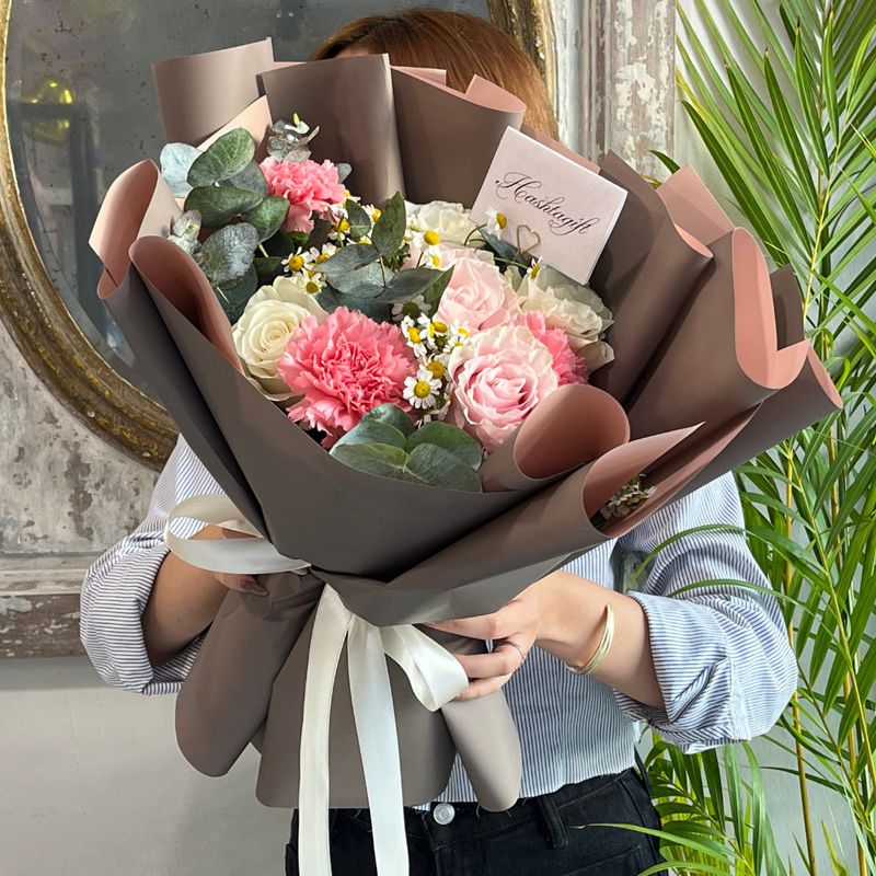Ramo de rosas, claveles y matricaria con complementos