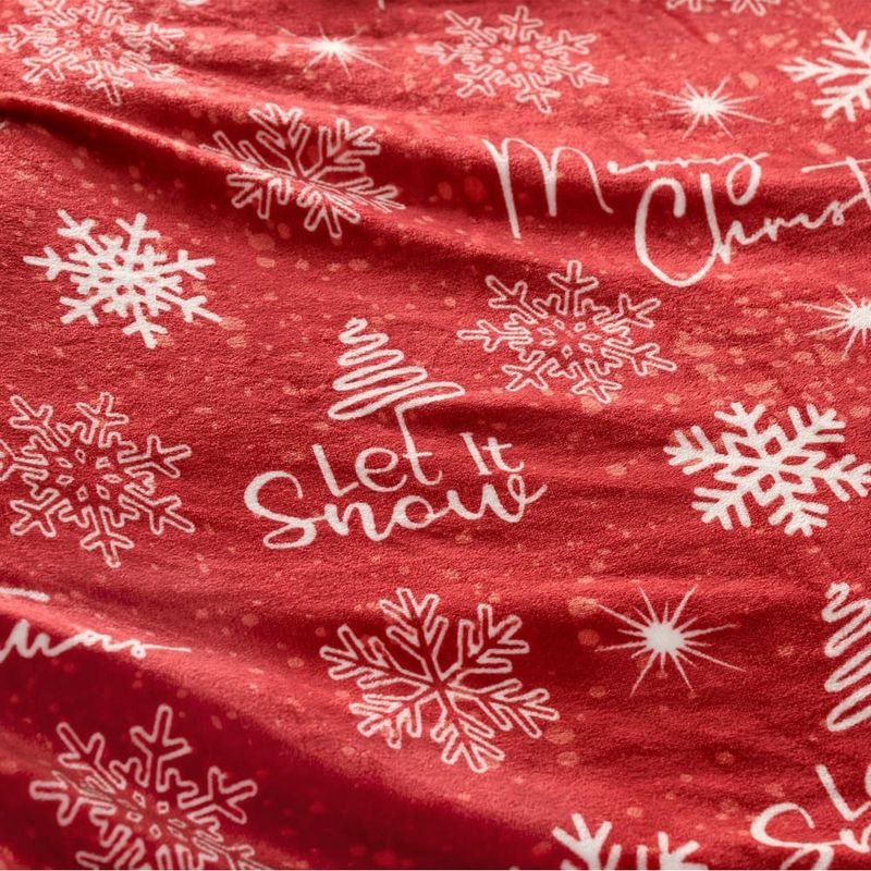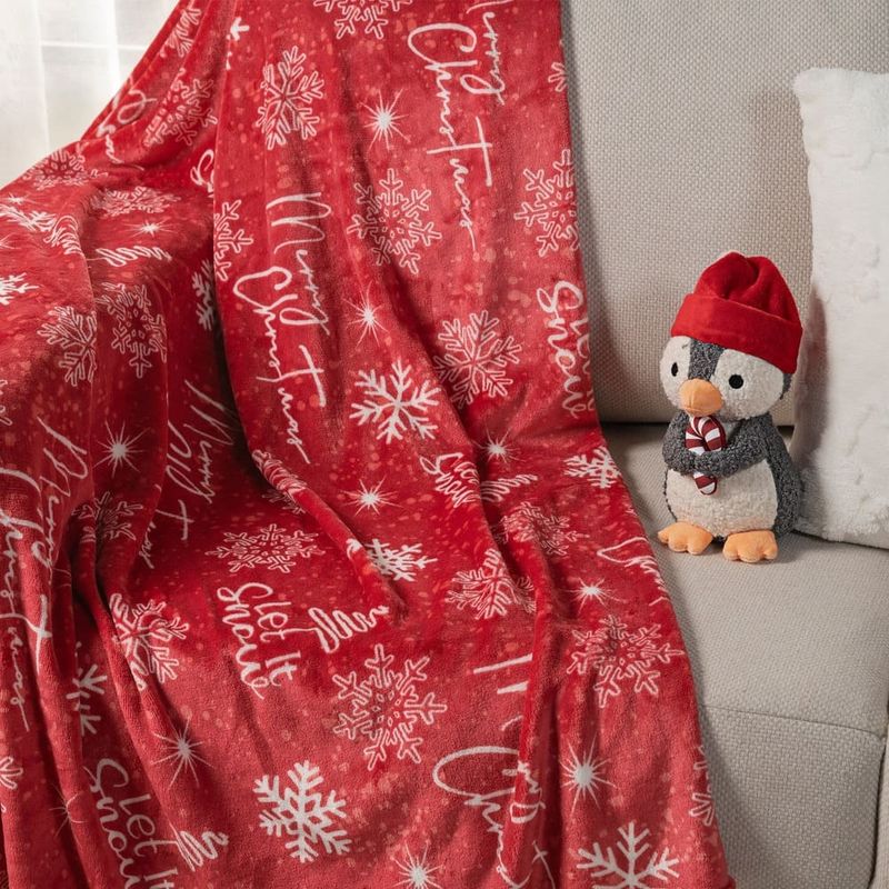 Nuestra throw blanket Merry Christmas será el regalo perfecto para esta temporada navideña por su festiva combinación rojo con blancos copos, a demás incluye un adorable peluche de pingüino