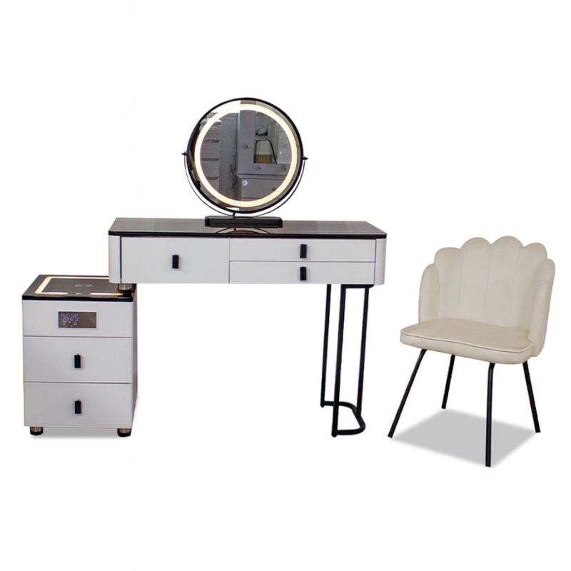 Incluye una silla acolchada con espuma de alta calidad, brindando una experiencia cómoda y sofisticada durante su uso. Su mesa inteligente integra una base de carga inalámbrica para teléfonos móviles, así como puertos USB y Tipo C, permitiendo mantener tus dispositivos siempre conectados. Además, posee reloj digital y bocina con conectividad Bluetooth, para que disfrutes de tu música favorita mientras te preparas.