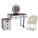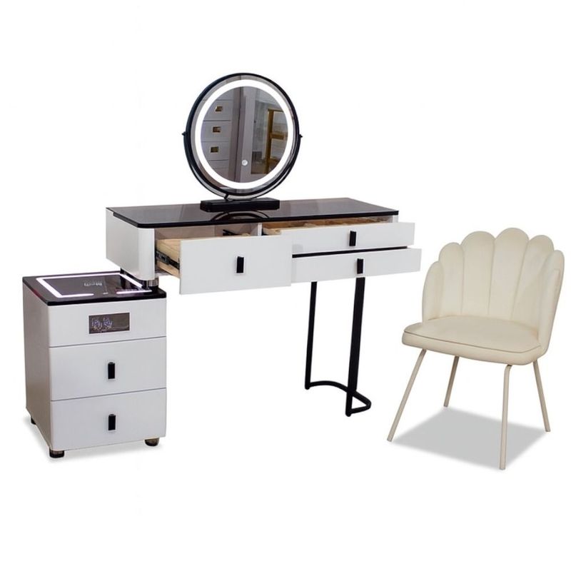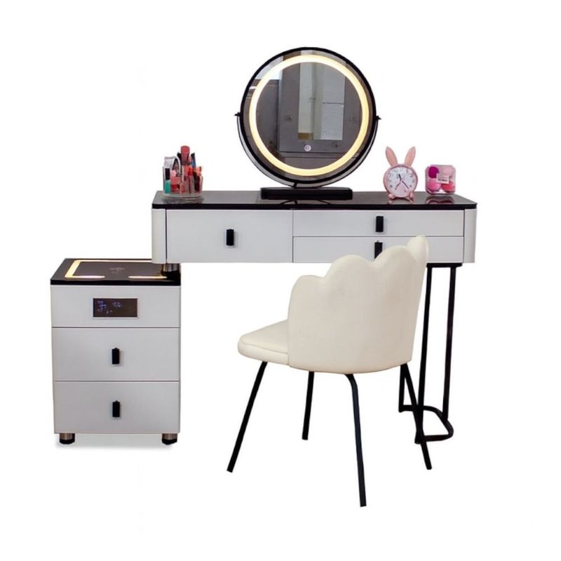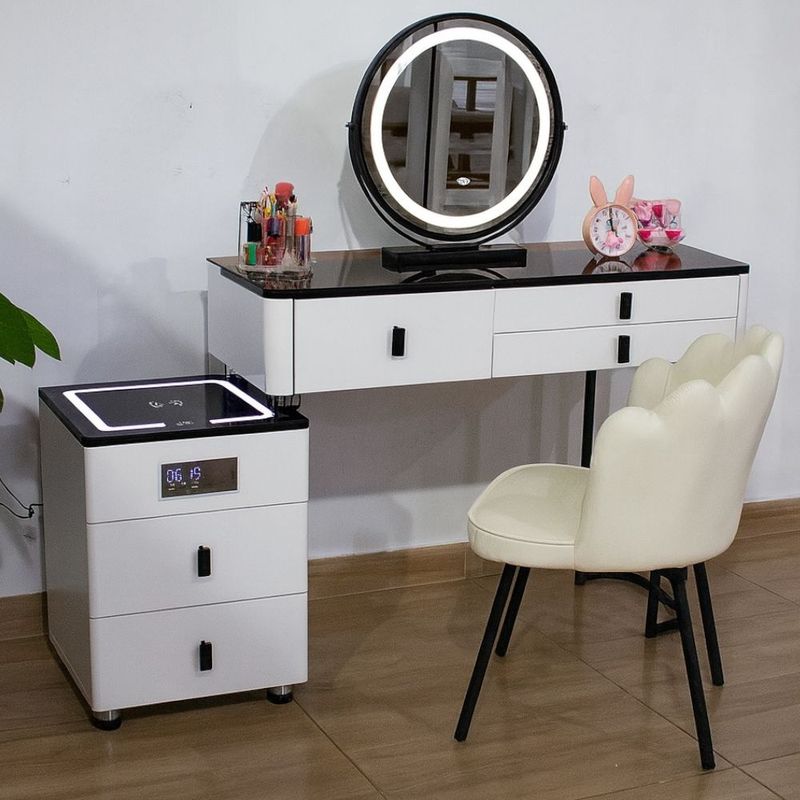 Diseñado para quienes valoran tanto la estética como la innovación, este tocador inteligente combina elegancia contemporánea con funcionalidades tecnológicas pensadas para el día a día. Cuenta con un espejo con luz LED ajustable mediante control touch, que permite seleccionar entre tres modos de iluminación: blanca fría, blanca natural y amarilla cálida, ideales para distintos momentos del día o estilos de maquillaje.