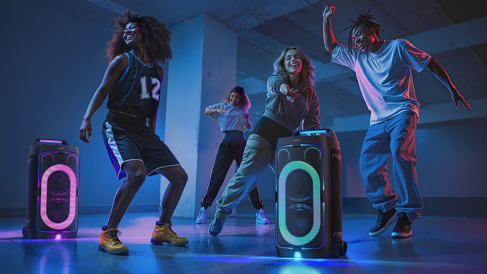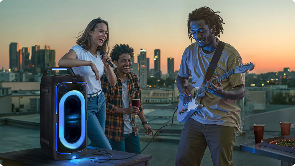 altavoz para fiestas Samsung MX-ST40F. Con 160 W de potencia máxima, graves ajustables y luces dinámicas tipo discoteca, este altavoz ofrece un ambiente vibrante y un sonido envolvente. Gracias a su batería integrada, podrás disfrutar de hasta 80 W sin necesidad de conexión eléctrica, mientras que su conectividad Bluetooth y opciones de entrada para micrófonos o guitarra hacen que cada fiesta sea única.