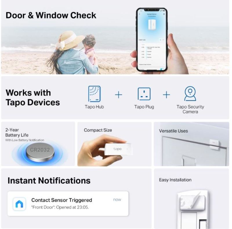 sensor de contacto inteligente Tapo T110 te permite supervisar en tiempo real la apertura y cierre de puertas, ventanas y mucho más, brindándote mayor control y tranquilidad en tu hogar. Es ideal para reforzar la seguridad y mantenerte informado sobre cualquier actividad inesperada, ya sea en accesos principales, armarios, refrigeradores o incluso buzones.