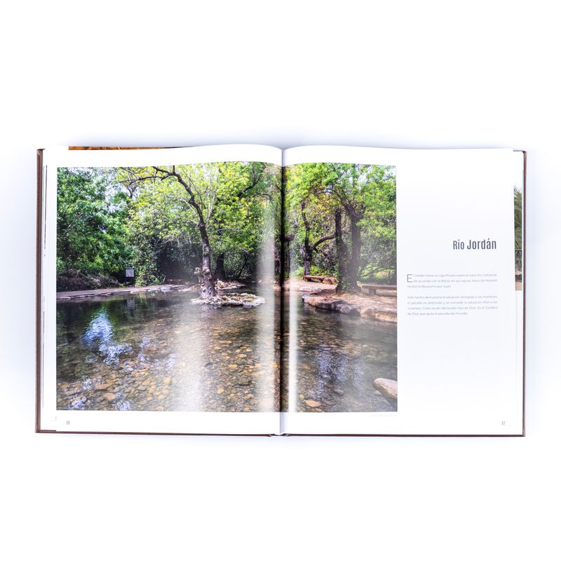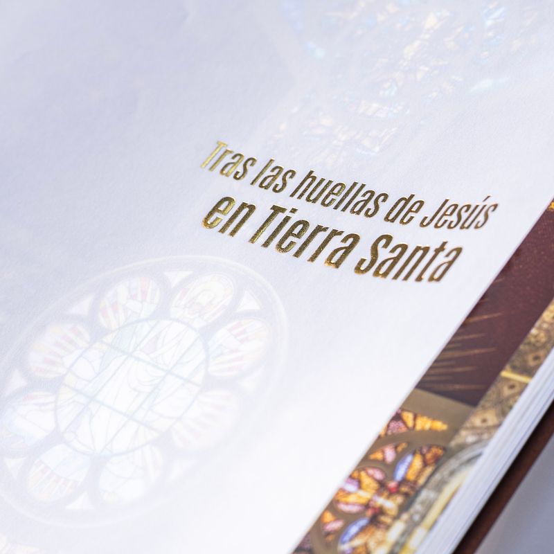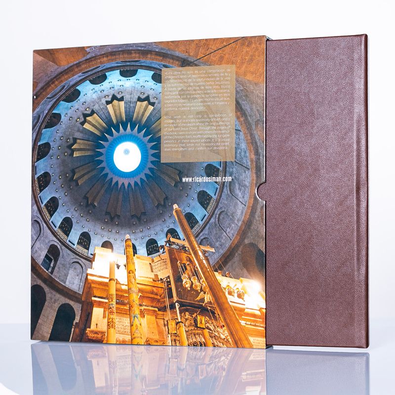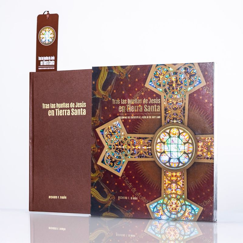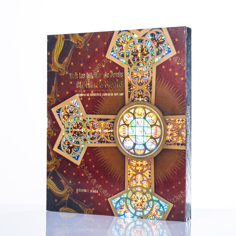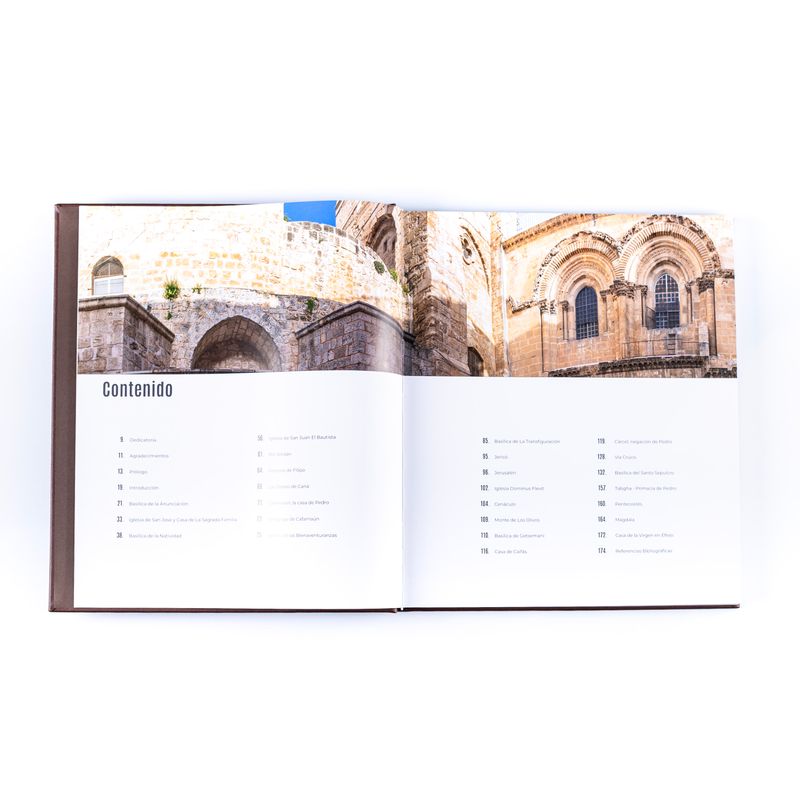 Contenido del libro:- Tras las huellas de Jesús en Tierra Santa, con más de 200 páginas, que recopilan imágenes de Israel, Palestina y Jordania, incluye descripciones en español y traducidas en inglés, citando pasajes bíblicos dedicados a los espacios que se muestran.
